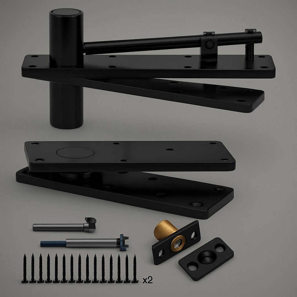 Prestige pivot hardware for architectural swing doors and oversized designs. Clean, modern movement with smooth pivot rotation.