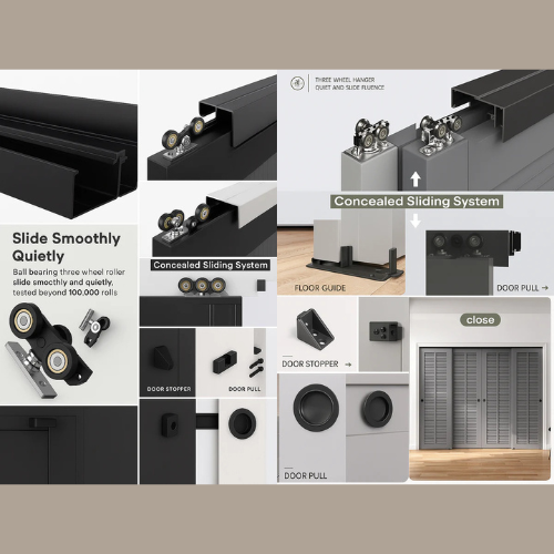 Space-saving folding system ideal for closets, laundry rooms, and wide openings. Includes complete hardware kit.